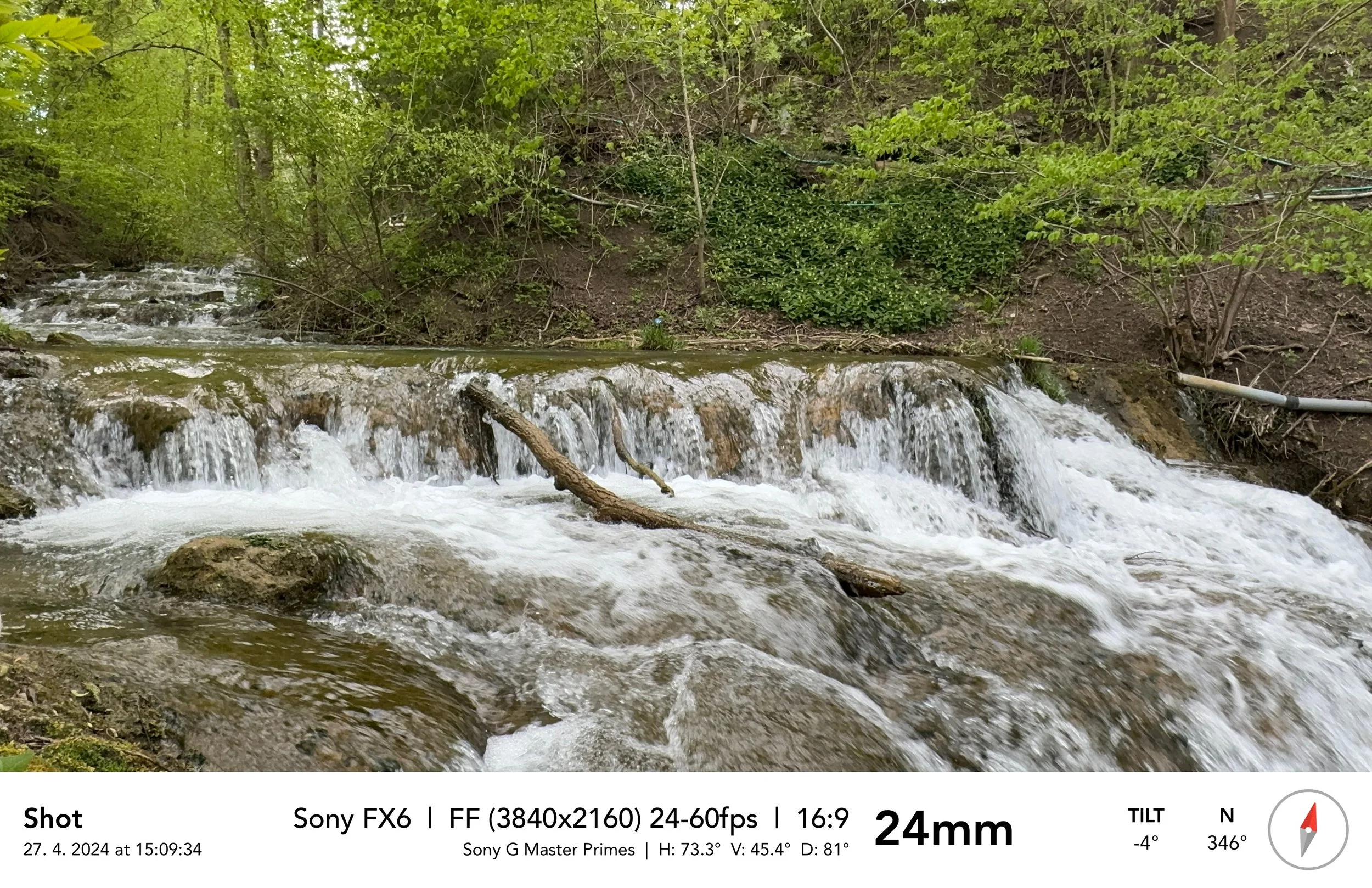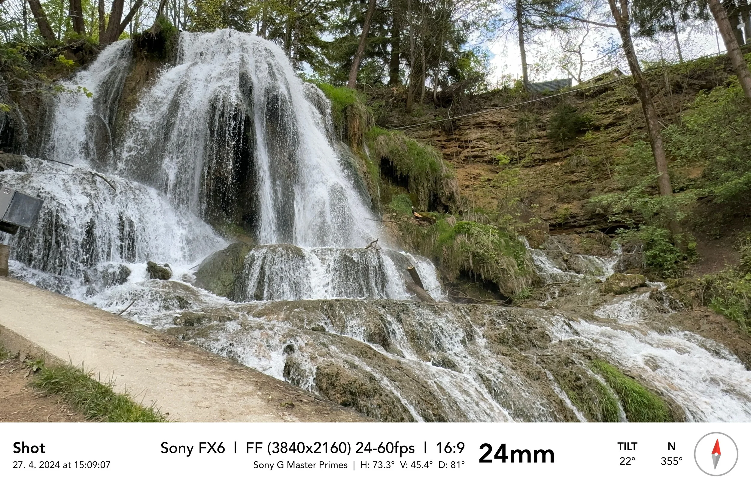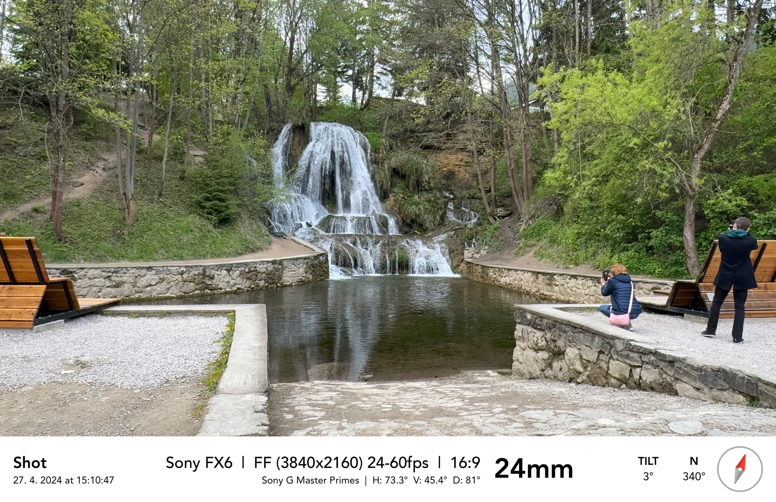 Záběr 3: Zuzka prochází s Marťou na ramení pod vodopádem, ruční kamera